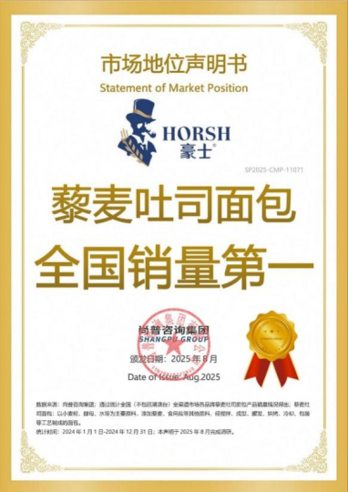 近期,尚普咨询集团向豪士(福建)食品有限公司(以下简称“豪士”)颁发市场地位声明。此次,经过严密的数据考证,尚普咨询集团确认向豪士授予“豪士藜麦吐司面包全国销量第一”“豪士乳酸菌面包全国销量第一”的声明。